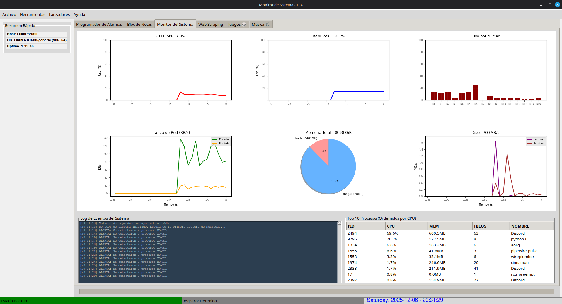 - Pestañas funcionales (Monitor, Alarmas, Notas, Scraping, Juegos, Música, Chat Local y Correo).